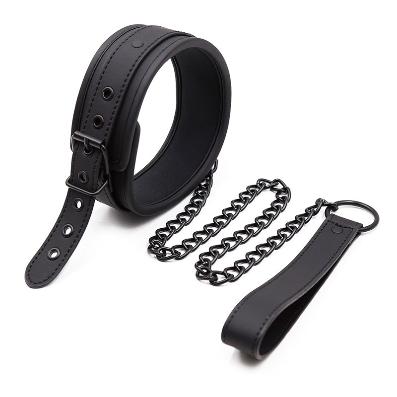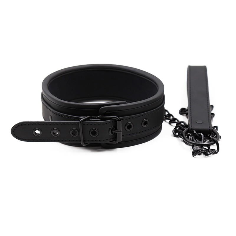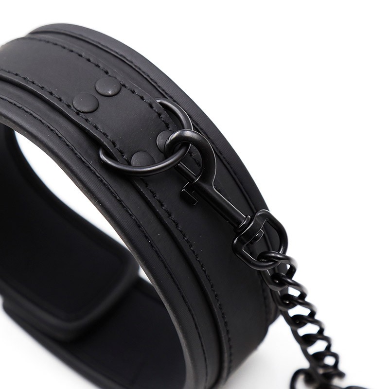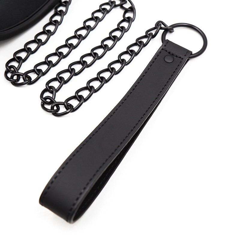 Collar de cuero sintético de la línea Dark Room. Su diseño sofisticado, con detalles decorativos completamente en color negro mate, elevarán cualquier look que decidas usar. Es acolchado, con cierre de hebilla ajustable, unido a una cadena desmontable, incluye correa para un mejor agarre.