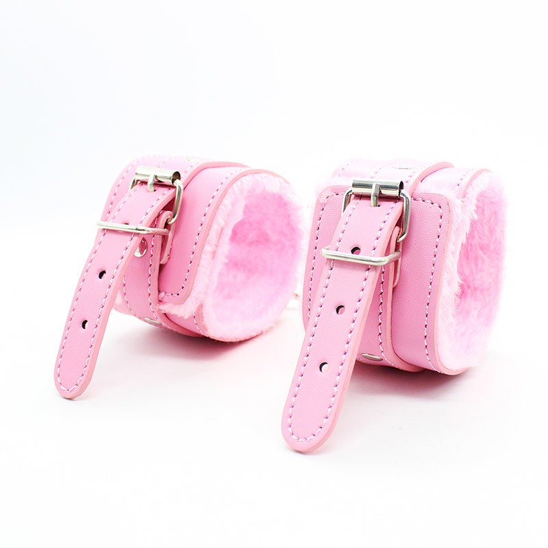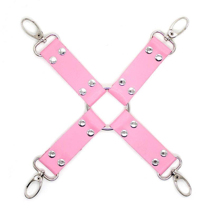 Esposas de muñecas y tobillos con enganche en X, interior forrado en suave felpa para mayor comodidad.