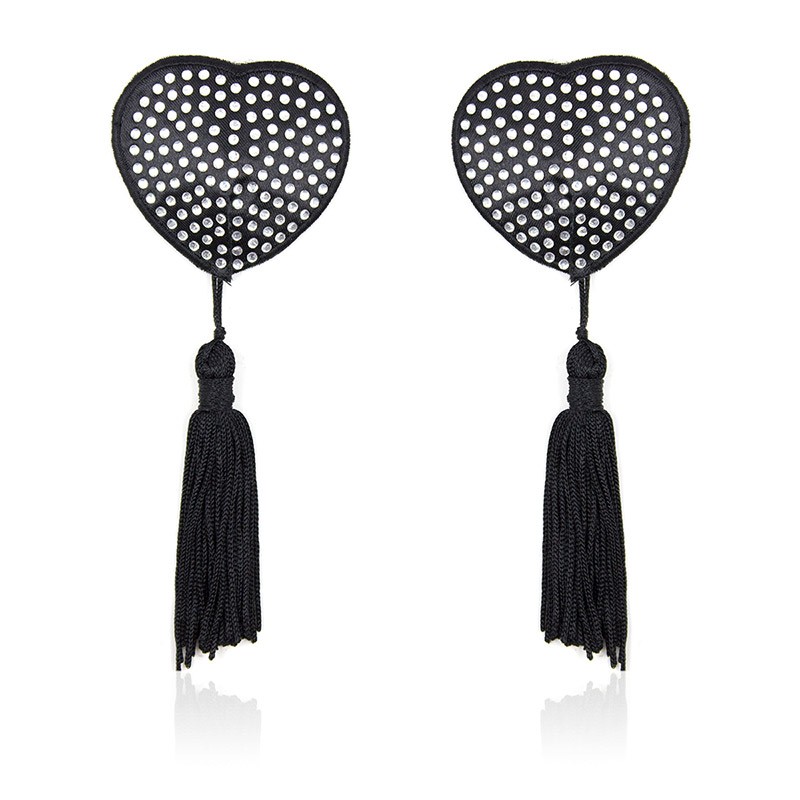 Pezoneras negras reutilizables auto adhesivas con forma de corazón, detalles de brillantes blancos y borlas. Se pueden usar hasta por 8 horas continuas. Son un complemento sencillo, fácil de usar y un componente erótico al que le sacarás mucho partido.
